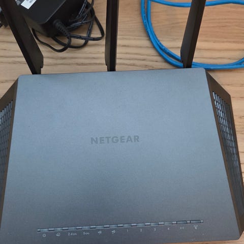 Linksys WRT1900ACS V2 Router med flere Ethernet-porter og USB-tilkoblinger. Enheten har en blå og svart farge, og er designet for kablet og trådløs nettverkstilkobling.