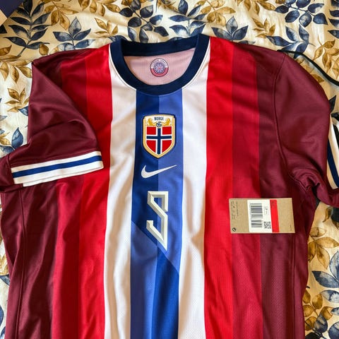 Nike Norge Haaland 23 fotballdrakt i størrelse Medium (barn). Drakten er rød med hvite og blå detaljer, laget av Dri-FIT materiale for fukttransport. Produsert i Thailand, designet for å representere det norske landslaget.