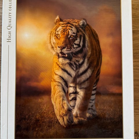 Puslespill med 550 brikker. Puslespillet er formet som ett tigerhode.