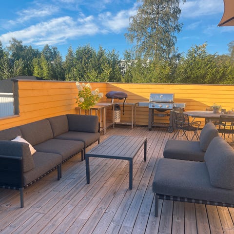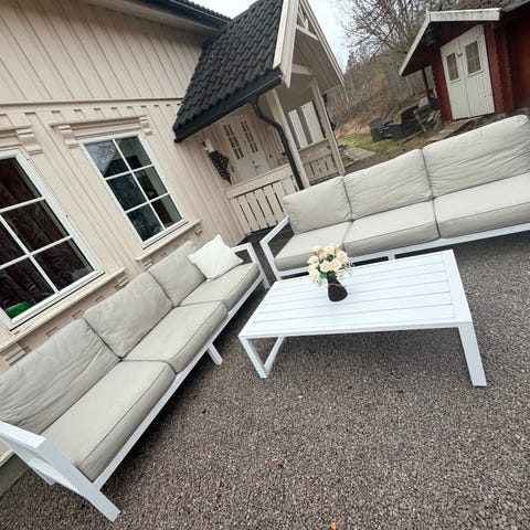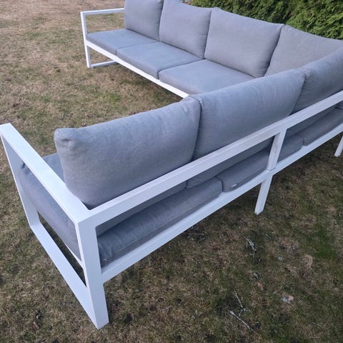 Flott, komfortabel og praktisk modulsofa i slitesterkt stoff fra Home & Cottage. Sofaen har stått ute under tak i to sommersesonger, og de siste månedene innendørs. Ser lite brukt ut.
