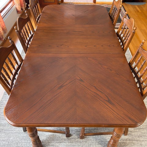 Bordet er laget fult av mørkt tre, med seks passende stoler. Hele settet er pent brukt og i god stand.