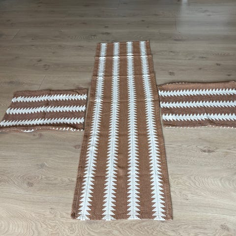 Brun, grå, svart, offwhite. Pent putetrekk og løper fra Princess.Putetrekket måler 50 x 50 Løperen måler 40 x 120 Gjennomsnittlig nypris på disse varene er 249 kr stykket. Selges samlet for 250 kr
