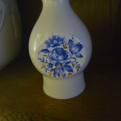 Selger min vintage Figgjo Norway vase i hvitt stentøy. Antakelig 1970-80-tallet. H 18 cm, B 12 cm, d. 4-5 cm.
