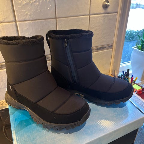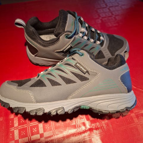 Vanntette piggsko (lave stabile tursko med pigger) fra Traxole i str 38. De er litt store i størrelsen. Jeg bruker vanligvis 38,5-39 i vintersko, men disse er perfekte for meg. Holdbare. Jeg har hatt et tidligere par av disse i fem år. De er like gode ennå, og jeg trenger ikke disse som jeg fikk til jul i fjor. Brukt en gang. Det er en «fabrikkfeil» på den ene skolissen -men det er bare å bytte losser hvis man ønsker. Gode ullsåler holder føttene varme 😊