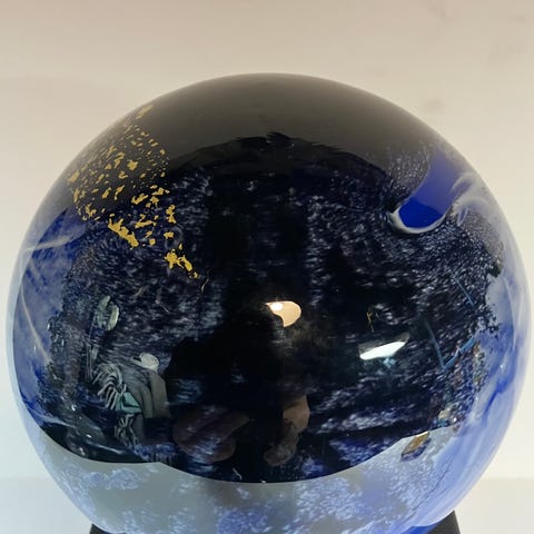 Selger en unik håndlaget glasskule i dype blå- og svarttoner med flotte mønstre og en kunstnerisk finish som gir et eksklusivt preg i interiøret.