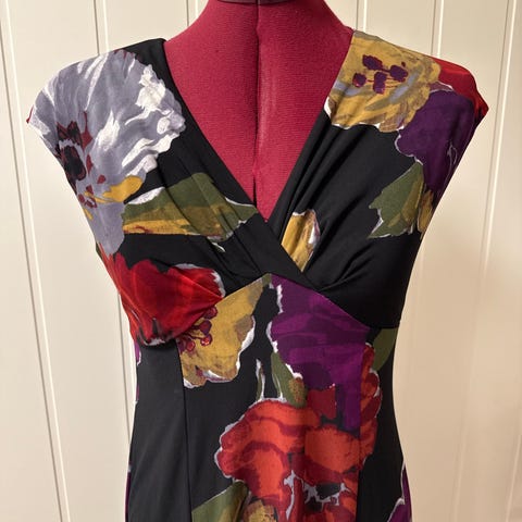 Mexx hverdagskjole i flerfarget bomull, størrelse 38. Kjolen har en elastisk midje med knyting.