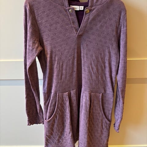 Rosa velourkjole med hette og fine detaljer.