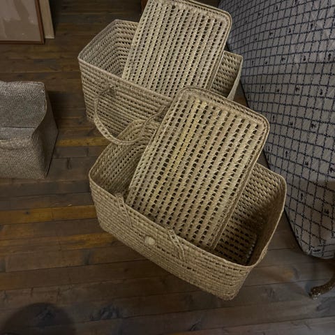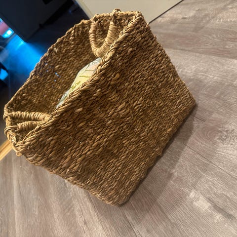 IKEA oppbevaringskurv for barn med svart og hvit stripet mønster og gul kant. Laget i lett materiale med håndtak på toppen for enkel åpning og lukking. Kan slås sammen.