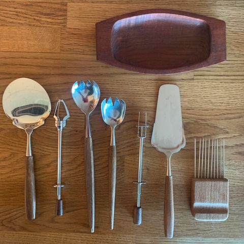 Retro isbøtte med klype med teakfarget endestykke. Isbøtten er 19 cm høy og klypen 19cm lang.