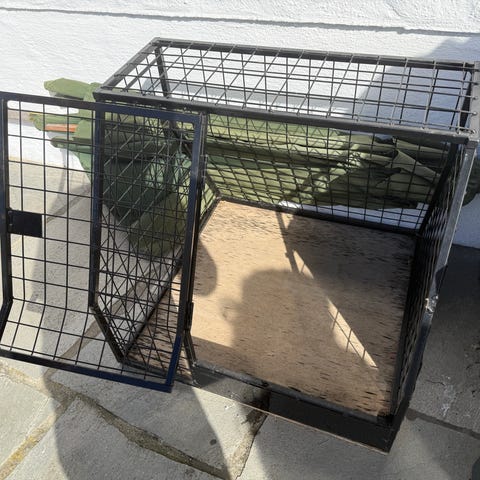 Ene buret har en skade på ene bakplata, kan ses på bildet. Mangler nøkkel til buret.
