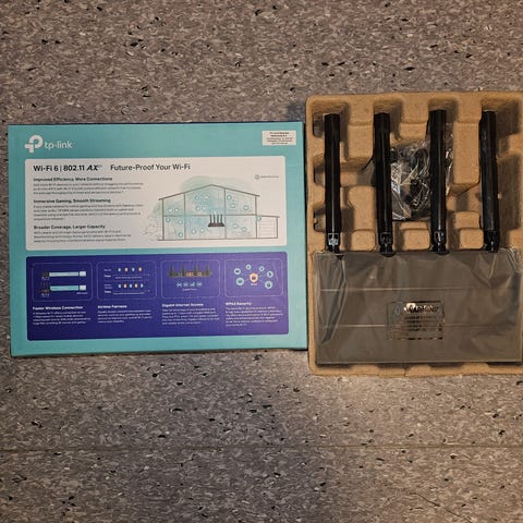 TP-Link Archer AX10 WiFi 6 router. En svart router designet for trådløs nettverkstilkobling med høy hastighet og stabil ytelse.