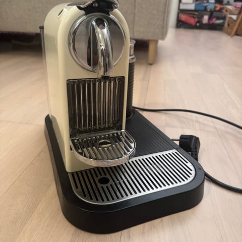 Selger en Nespresso Citiz kapselkaffemaskin i fin kremhvit farge med integrert melkeskummer. Maskinen lekker dessverre, så enten må den repareres selv eller leveres på service/reparasjon. Pumpa og elektronikken fungerer.