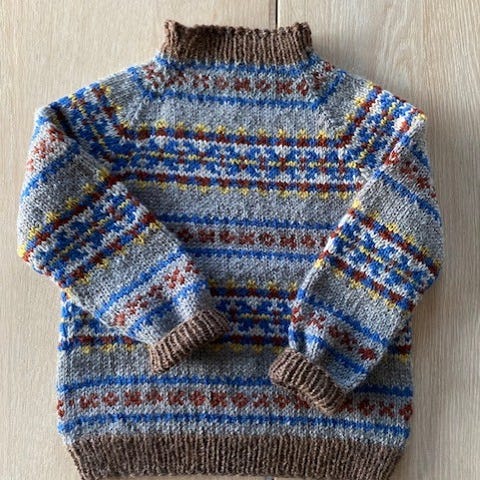 Hjemmestrikket av min kjære strikkeglade mor, en ekte bestemor (her i huset heter hun bare Granny). Genseren er helt nystrikket og ikke brukt av noen.