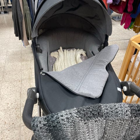 Stokke barnevogn med justerbar sitte- og liggestilling, fire hjul. Vognens ramme er laget av metall med stofftrekk i gråfarge. Egnet for barn i småbarnsalder.