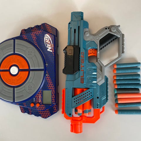 Nerf X-Shot lekepistol med dobbel trommel for dartpiler. Leveres med seks blå dartpiler. Egnet for barn og lek.