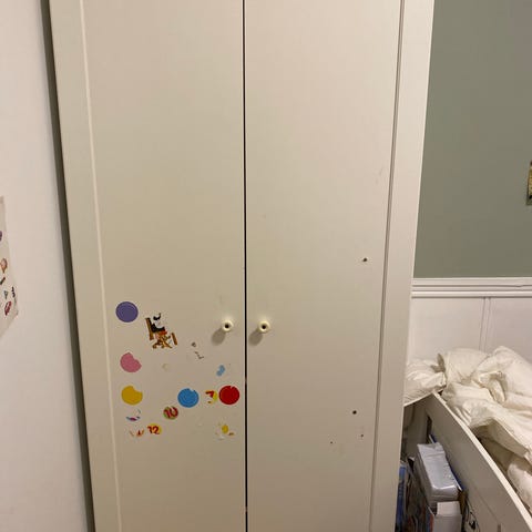 IKEA barnemøbel skap med skuffer i blå og hvit farge. Møbelet har flere oppbevaringsrom inkludert skap og skuffer, egnet for organisering i barnerom.