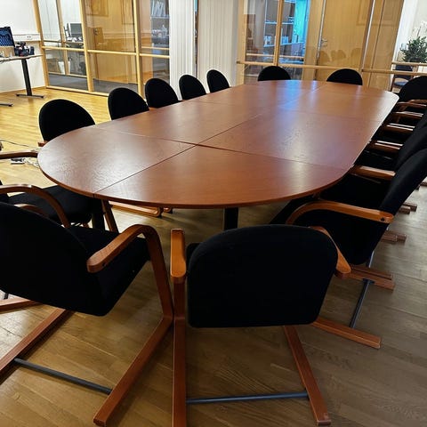 Pent brukt solid heltre furubord malt med høykvalitets 3 stjernes gulvmaling fra jotun. I fargen mellow fra jotun, en veldig moderne farge nå. Pent malt, ett par små hakk i bordplaten som vist på bildet, stoler er trekt om til en matchende farge, selv om bordet sikkert er fra 2010 tallet, fremstår det som moderne. Og lite brukt. Veldig slitesterk maling og robuste trematerialer.