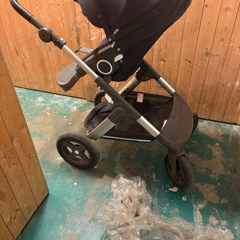 Stokke barnevogn i grå farge. Barnevognen har fire hjul, justerbart håndtak og sammenleggbart design for enkel oppbevaring og transport. Egnet for barn og tilbyr komfortabel sittestilling.