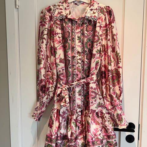 Nydelig skjortekjole med belte i midjen. Brukt et par timer to ganger bare. Hele kjolen er i blonder men "kroppen" har en underkjole så ikke alt synes 😊