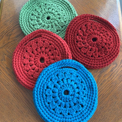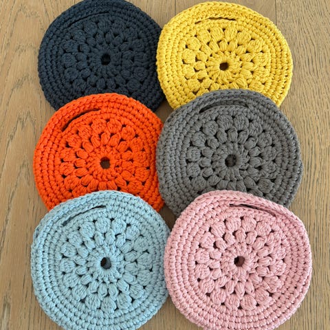Håndlaget heklet sett med kurv og 6 glassbrikker i ulike farger