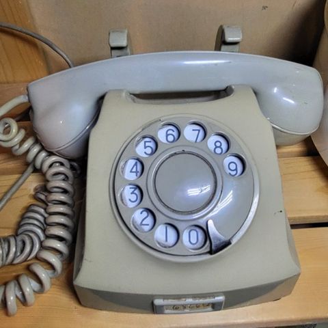 Ringetelefon kombinert bord og vegg 1954 modell. Fin til utstilling også. Grå. Kr 190,-.