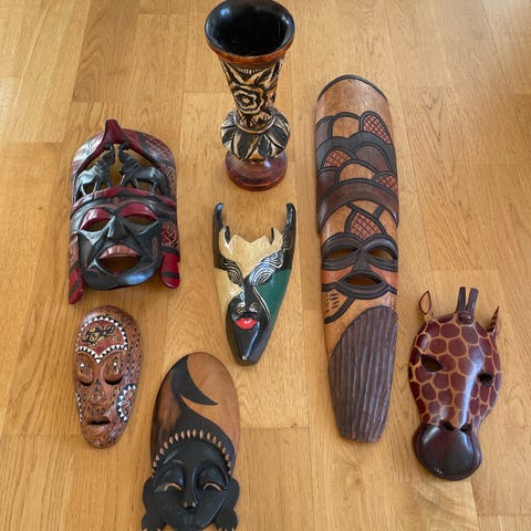 Håndskjærte tremasker fra Asia og Afrika.
