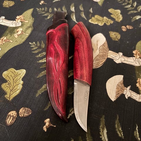 Mora Classic kniv med blad i rustfritt stål og håndtak i rødt tre. Leveres med brun lærslire. Egnet for friluftsliv og generell bruk.