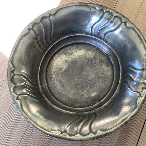Den er stor og tung/massiv. Den er 33 cm bredde med hankene og 25 cm i diameter og 13 cm høyde. En solid tinn bolle som er norsk. Selges for 180kr.