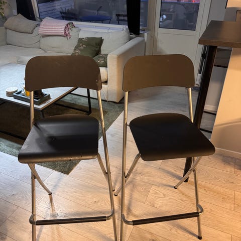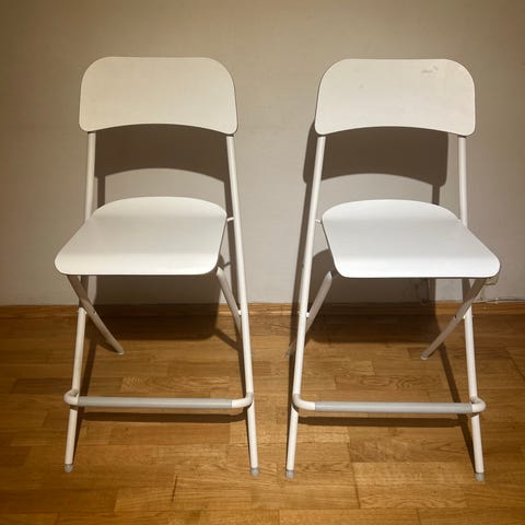Selger to sammenleggbare klappstoler i modellen Franklin fra IKEA. Nypris per stol er kroner 595. Stolene har noen vanlige bruksmerker. Den ene stolen mangler delen nederst på det ene beinet. Samme stol har noe misfarge på sittedelen, se bilder. Mulig noen merker kan vaskes av.