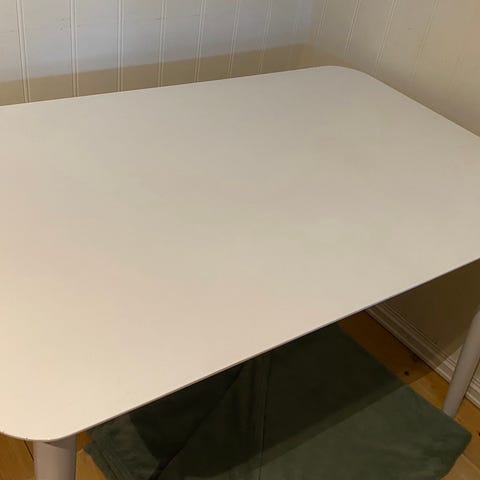 IKEA spisebord med hvit bordplate og metallramme. Enkel og funksjonell design.