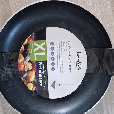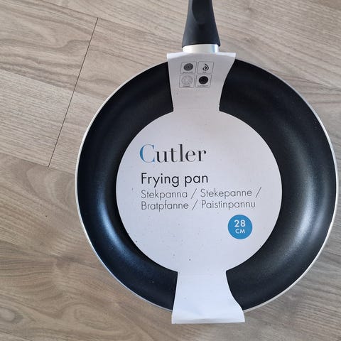 Pannen har en svart non-stick belegg og et håndtak i svart plast.