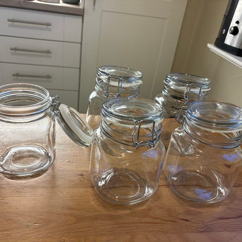 28 glasskrukker med lokk. Mange forskjellige størrelser.