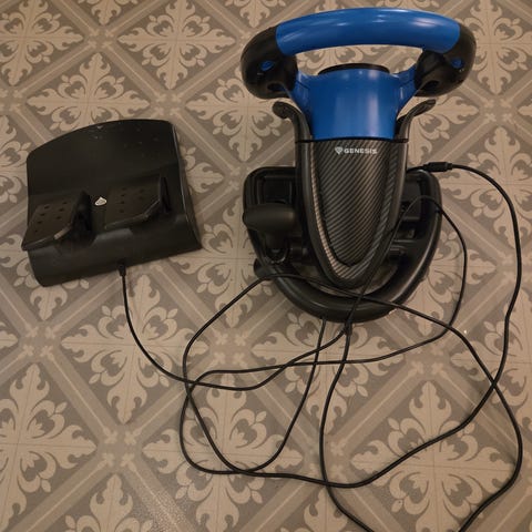 Genesis Seaborg 350 spillratt med tilhørende pedaler. Rattet har en svart og blå fargekombinasjon og er utstyrt med flere knapper for spillkontroll. Pedalene er plassert på en separat base og kobles til rattet med ledning. Produktet brukes til racing- og kjøreopplevelser i spill.