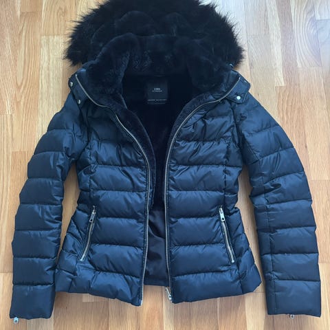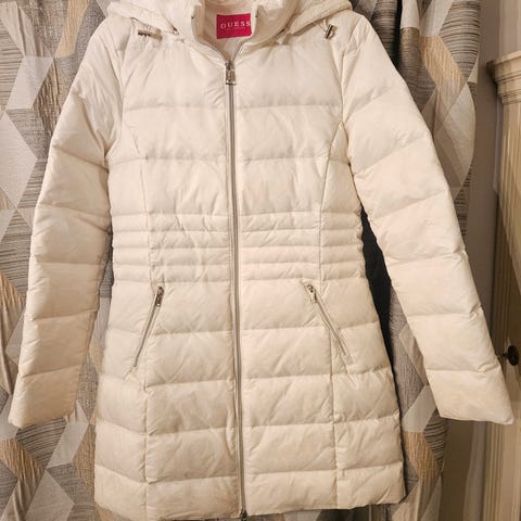 Guess dunjakke i str. XS. Jakken er svart og laget av dun, noe som gir isolasjon og god varme på vinteren. Pelskanten på hetten er avtagbar, passer fint for ungdom da den er liten og nett i modellen.