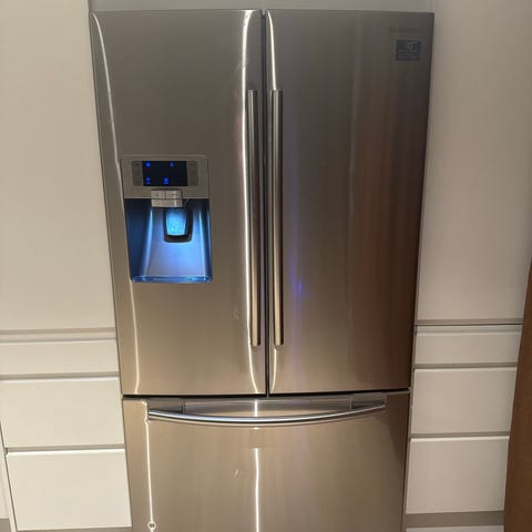 Pent brukt Samsung Side-by-Side kjøleskap i rustfritt stål med vann- og isdispenser. Kjøleskapet har franske dører øverst for kjøledelen og en skuff nederst for fryseren. Kjøleskapsdelen har et nettovolum på 426 liter. Den er utstyrt med fem glasshyller, to grønnsaksskuffer og en ferskvare område.