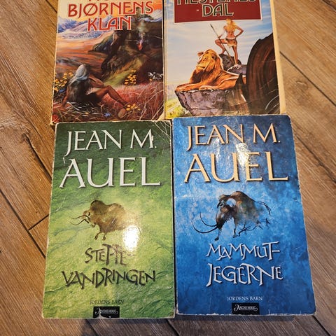 Jean M. Auel bokserie «Jordens barn» med 5 bind. Bøkene er på norsk og inneholder tekst i standard bokformat.