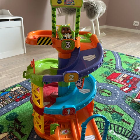 Morsom bilbane for små barn. Kan bygges på forskjellige måter og utvide med nye deler.