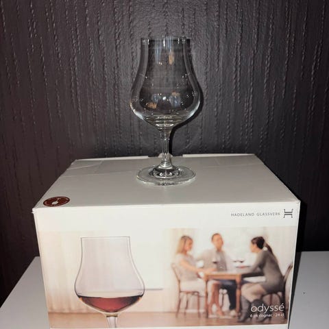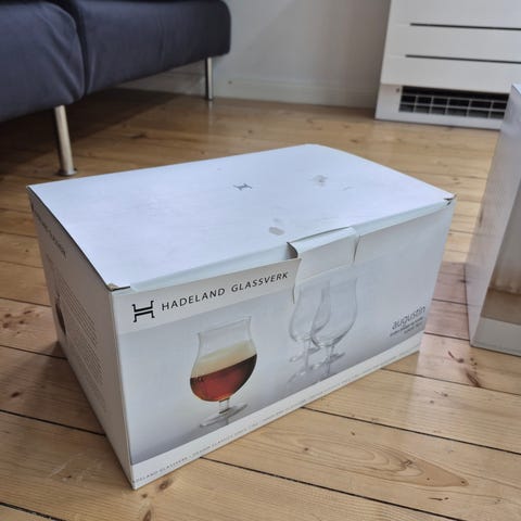 En kartong med 6 stk ølglass fra Hadeland i serien Augustin selges til 300kr.