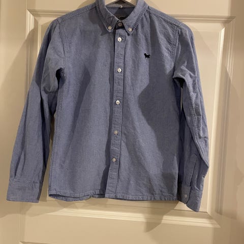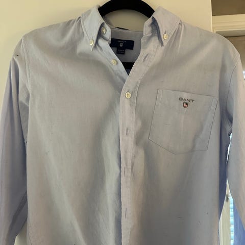 GANT skjorte for barn i størrelse S tilsvarer 6 år, laget av bomull. Skjorten har lys blå farge og klassisk design med krage og knappelukking.