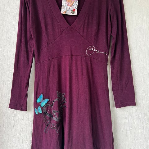 Desigual kort kjole i størrelse XS for kvinner. Kjolen er flerfarget og laget av bomull. Den har lange ermer med fargerike mønstre og et dekorativt design på forsiden.