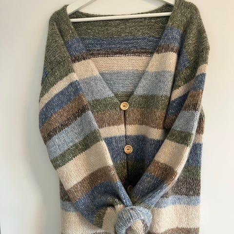 Nystrikket cardigan str. L/XL strikket i Tynn Silk Mohair selges for 1000,-kr.