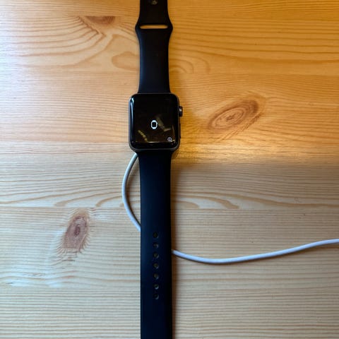 Apple Watch Series 3 / 38 mm smartklokke med svart reim og sølvfarget urkasse. Klokken har en rektangulær skjerm og er utstyrt med sensorer på baksiden for helse- og aktivitetsmåling. Flere riper og bruskskader, se vedlagt bilder. Flere skraper på skjermen. Selges rimelig grunnet overgang til ny versjon. Kom gjerne med bud 😊