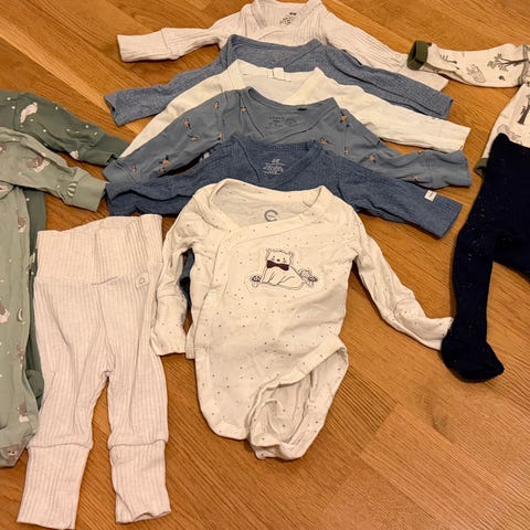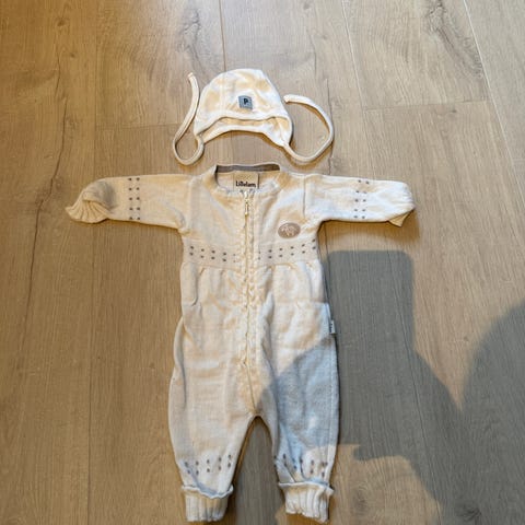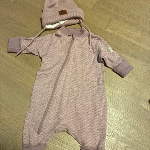 Søt dress / pysj og balaclava i merinoull. Dessverre blitt hull, se bilde. Men pent brukt utenom det. Holder mini varm og god forde.
