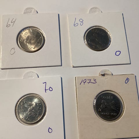 Myntsett med 10 cent mynter fra årene 1887 til 1907. Myntene er plassert i individuelle papirholdere for beskyttelse og enkel håndtering.selgeskr850,-+ frakt