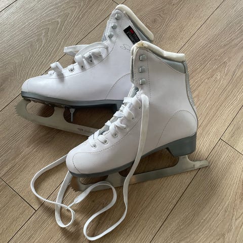 Jofa Ishockeyskøyter for barn med størrelse Annet. Skøytene er laget for ishockey og har svart farge med hvite lisser og hvit skøytebladholder.