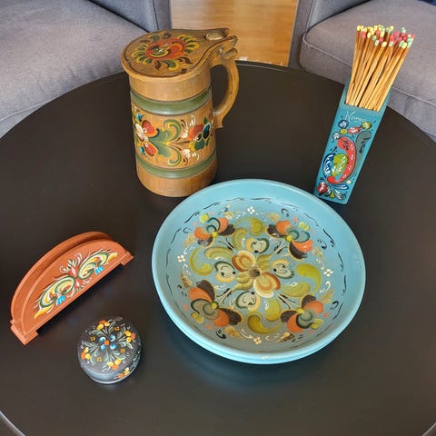 Roseoppsats i silke, naturtro. Skål i glass. Må hentes på Dalgård