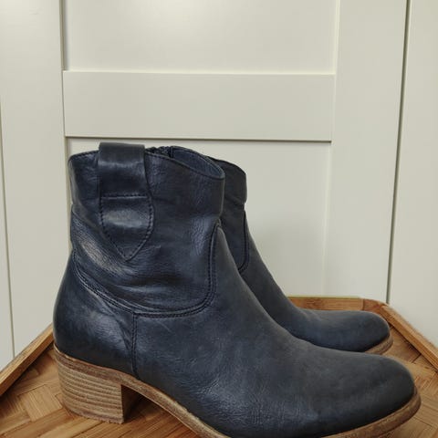 Brukt kun en gang. Cowboystøvletter i mørkeblå skinn. Størrelse 36, for smale føtter. Kan enten hentes på Bryne eller sendes med fiks ferdig.