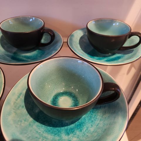 4 små kopper av keramikk med glasur i turkis og svart med underfat.