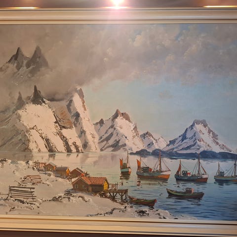 Maleri som viser et fjellandskap med snødekte fjell, en båt på vannet og flere små hytter langs vannkanten. Bildet har en dempet fargepalett med fokus på natur og tradisjonelle elementer. 60 x 40 cm.