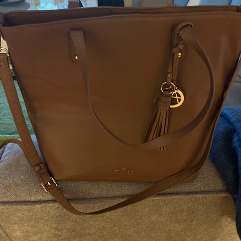 Even&Odd veske laget av kunstlær. Vesken har en brun farge og inkluderer både håndtak og en avtagbar skulderrem for fleksibel bruk.